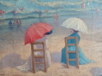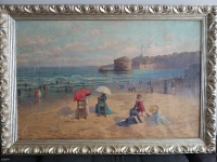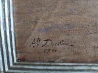 Magnífico óleo sobre lienzo de 98,5 x 63,5 cm de largo. Pintor francés. Firmado abajo a la izquierda: Dubois, 1900. Este lienzo está pintado por ambos lados, el reverso es un paisaje forestal. Hay una pequeña reparación en la parte posterior del lienzo.